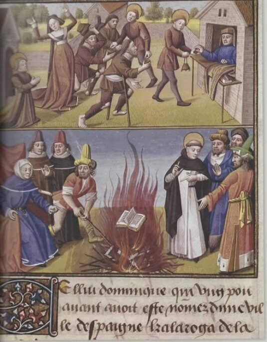Mentre l'Inquisizione doveva ricorrere al sotterfugio del "ricorso al braccio secolare" per giustiziare i vivi, emetteva liberamente una sentenza di rogo postumo contro quei "morti nell'eresia" che erano stati scoperti dall'inchiesta troppo tardi per essere bruciati vivi. Durante le sessioni di sermoni, i defunti ricevevano una sentenza nominale e dettagliata, che stabiliva che dovevano essere "riesumati dalla terra consacrata dei cimiteri se le loro ossa potevano essere distinte da altre ossa cattoliche", poi trascinati per le strade su graticci e infine bruciati nelle piazze pubbliche. Questa pratica di potere religioso era considerata la più abominevole tra il popolo cristiano e fu all'origine di numerose rivolte popolari contro l'Inquisizione. Anche gli edifici che avevano ospitato luoghi di consolazione e altre "cerimonie empie" ricevevano la loro condanna, condannati alla demolizione e all'incendio, il luogo destinato a rimanere maledetto, aperto e disabitato. L'eresia venne sradicata