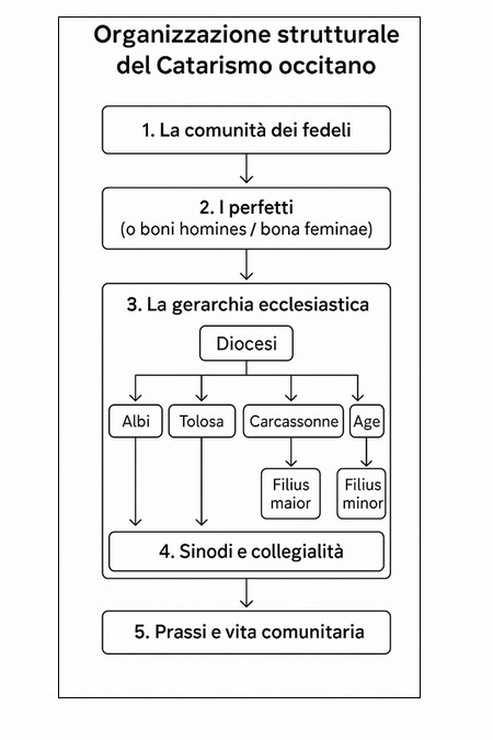 Il Catarismo occitano non fu un movimento disorganizzato, ma una Chiesa parallela e strutturata, con diocesi, vescovi e clero regolare (perfetti), sostenuti dalla base dei fedeli. Questa solidità spiega sia la sua rapida diffusione in Linguadoca, sia la gravità della reazione cattolica (Crociata albigese, Inquisizione).