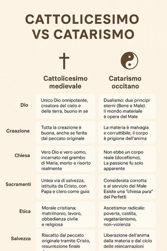 Il Catarismo si basava su un cristianesimo dualista, ascetico e spiritualista, che negava la bontà del mondo materiale, rifiutava la mediazione della Chiesa cattolica e indicava nel Consolamentum e nella vita ascetica la via di salvezza.